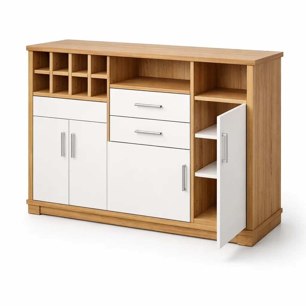 Buffet fabriqué en panneaux de particules plaqué chêne et MDF laqué. Il dispose de deux tiroirs, quatre étagères et plusieurs compartiments. Les portes sont battantes, avec espace de stockage pour bouteilles.